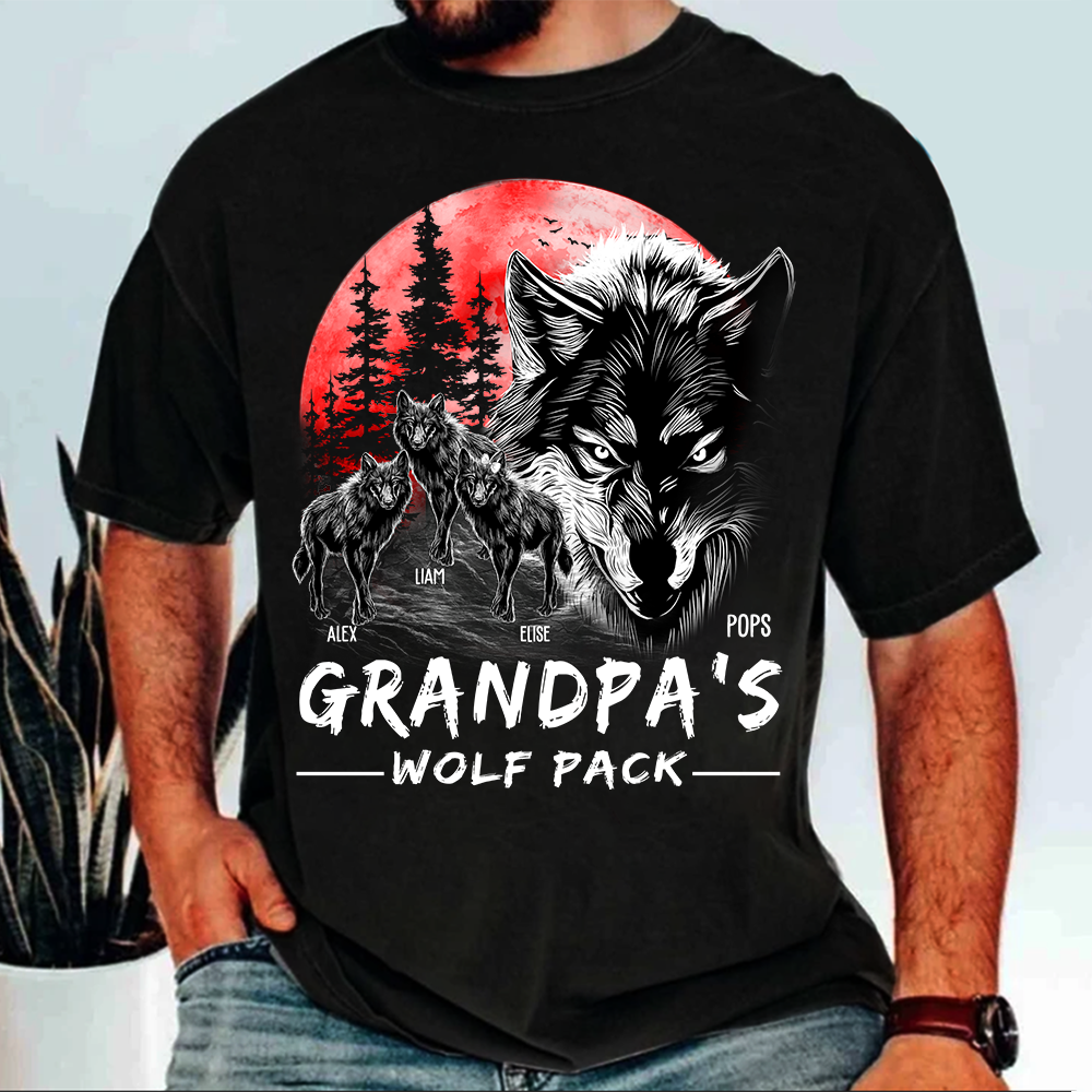 - Bold Typography: The phrasing “Grandpa’s Wolf Pack” is presented in a rugged, hand-painted font, reinforcing the shirt’s theme of unity and rugged masculinity while maintaining readability and style.