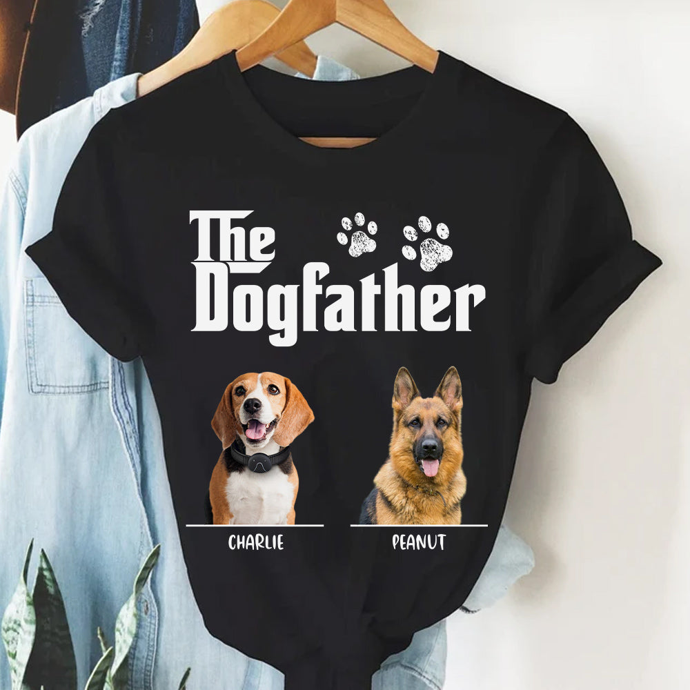 The Dogfather Custom Dog Lover T Shirt Personalized Pet Gift Tee is a charming and unique apparel piece designed for devoted dog parents. Featuring playful paw prints and customizable dog portraits with names, this shirt perfectly celebrates the special bond between you and your furry companions.