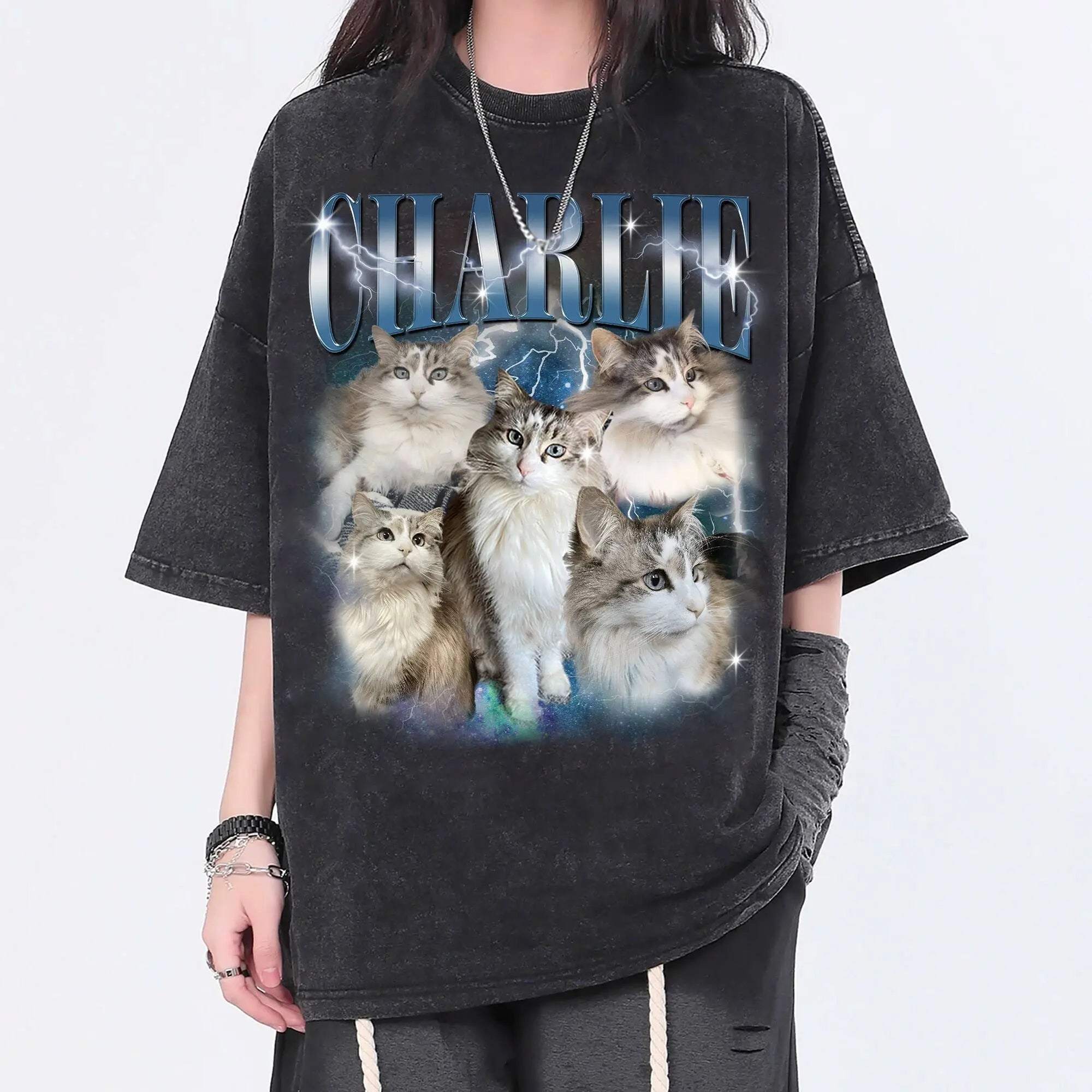 - Unique Cat Collage Design: The shirt displays an artful arrangement of cat images surrounded by lightning effects, creating a dynamic and nostalgic visual appeal that highlights your love for feline friends. Explore more designs at Custom Cat Shirts.