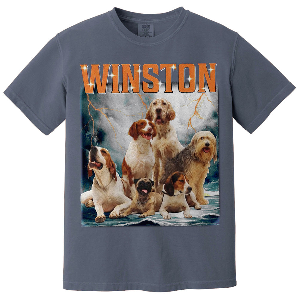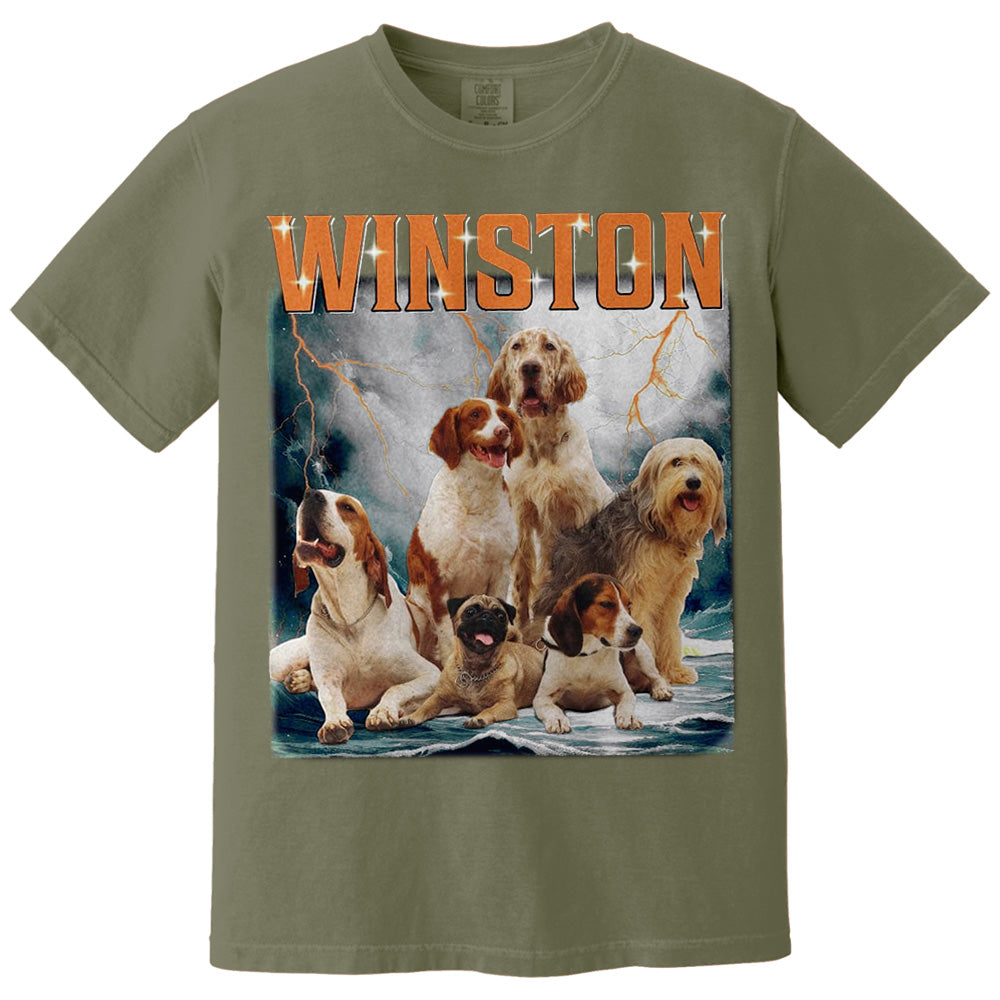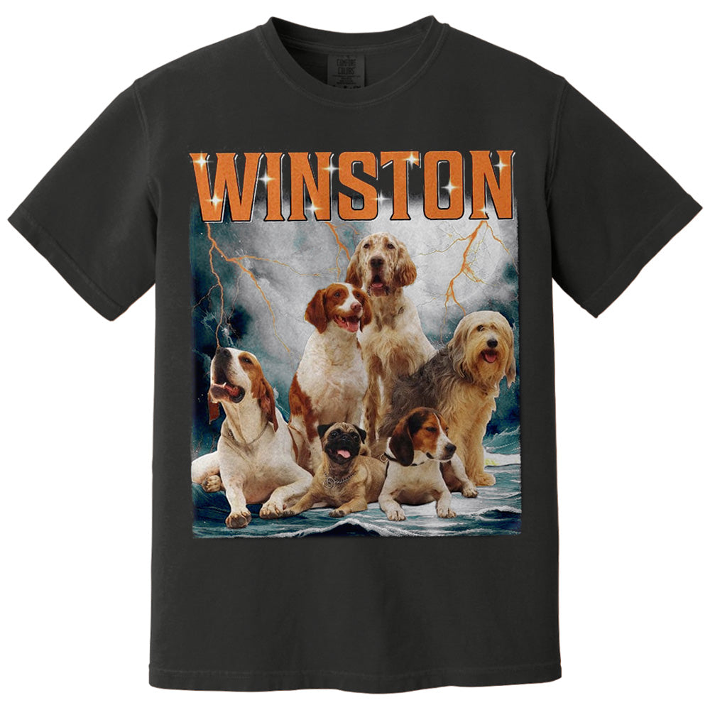 The Winston Dog Lover Shirt Cute Dogs Graphic Tee Top for Men Women showcases an eye-catching design featuring a charming group of dogs set against a dramatic backdrop. This tee perfectly blends playful canine imagery with bold typography, making it a must-have for dog enthusiasts who want stylish, casual wear that reflects their passion for pets.